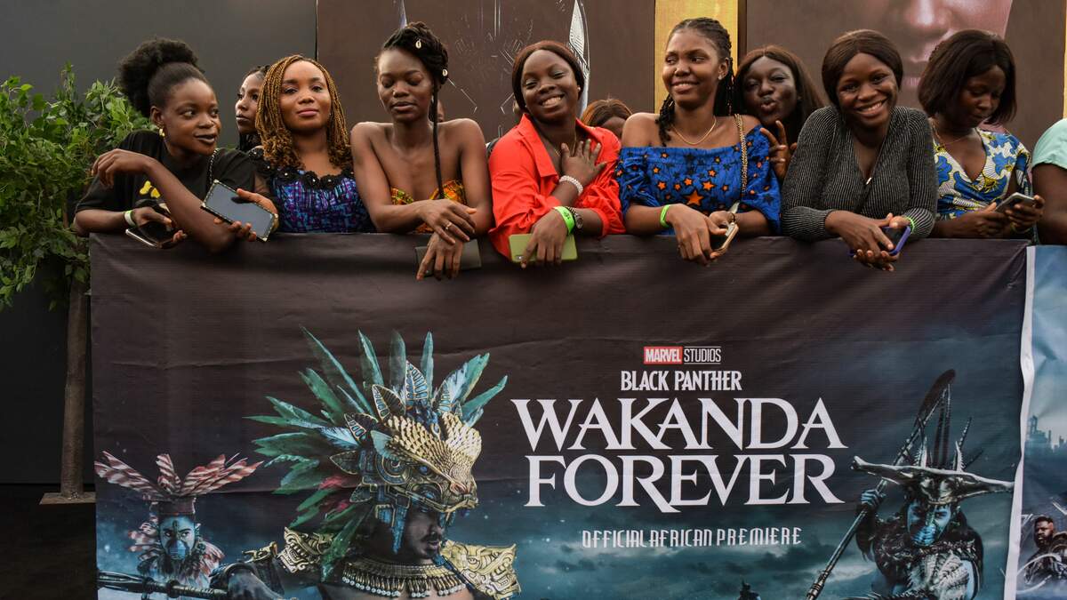 Fans lean on a banner as they wait to get into the African premiere of the film "Black Panther: Wakanda Forever" in Lagos, on November 6, 2022. - The African premiere of the Marvel superhero film "Black Panther: Wakanda Forever" is taking place in Lagos, a leading commercial hub for African entertainment ahead of the film's global release on November 11. (Photo by PIUS UTOMI EKPEI / AFP) (Photo by PIUS UTOMI EKPEI/AFP via Getty Images)Photo: Getty Images